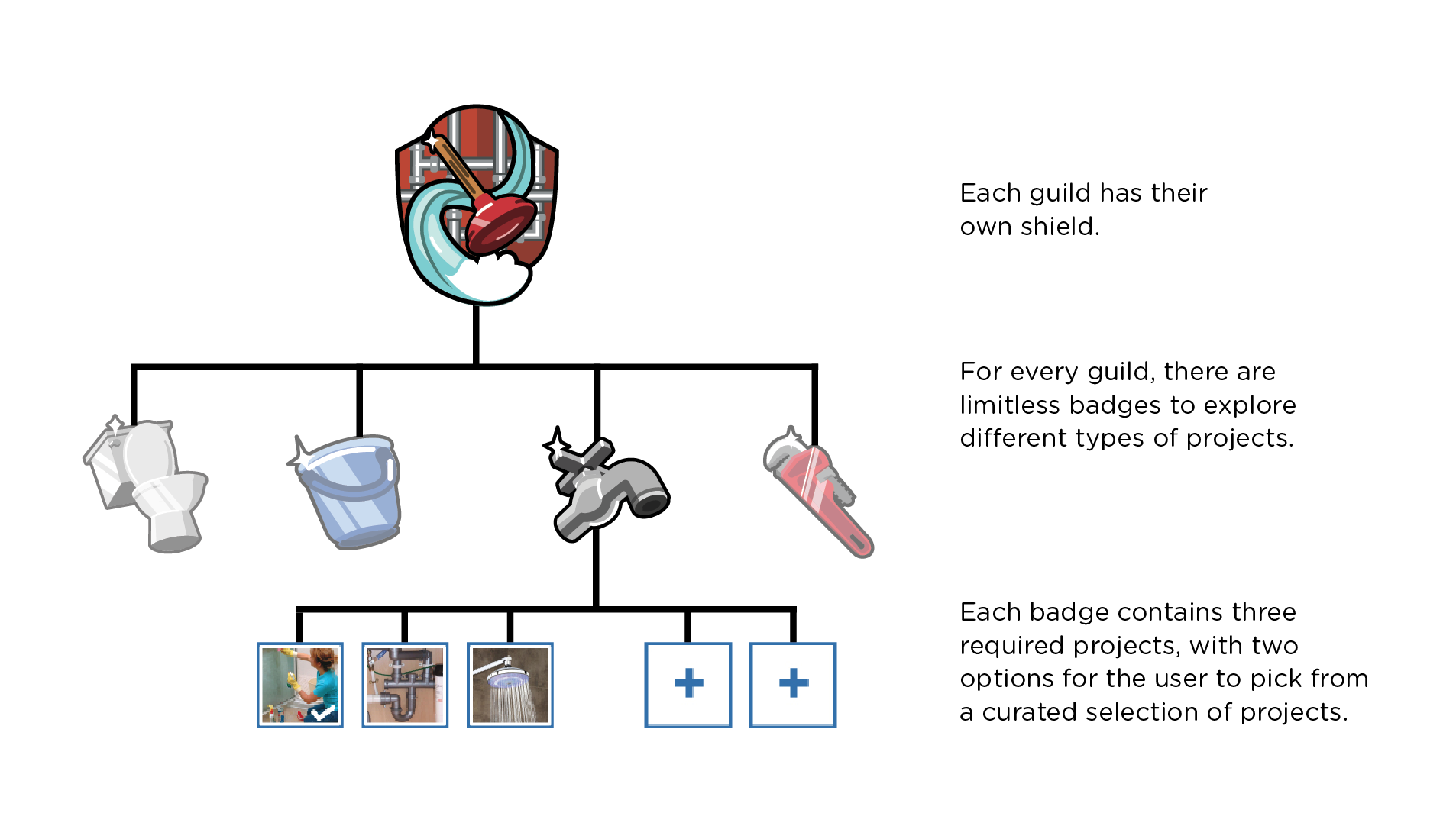 After selecting a guild, the user will select one of the floating badges to see the projects they need to complete the level, and get the badge.